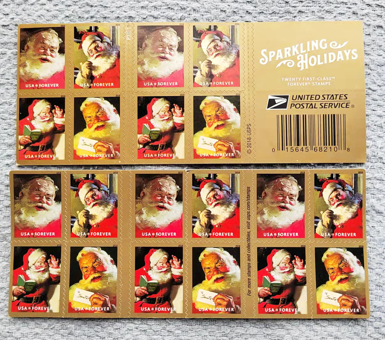 The Sparkling Holidays stamps, sold in booklets of 20, feature four classic portraits of Santa Claus. Taken from larger paintings created by Sundblom, these vintage images were originally published in ads for The Coca-Cola Company from the 1940s through the early 1960s. Sundblom is credited as the individual who most refined the modern image of Santa.