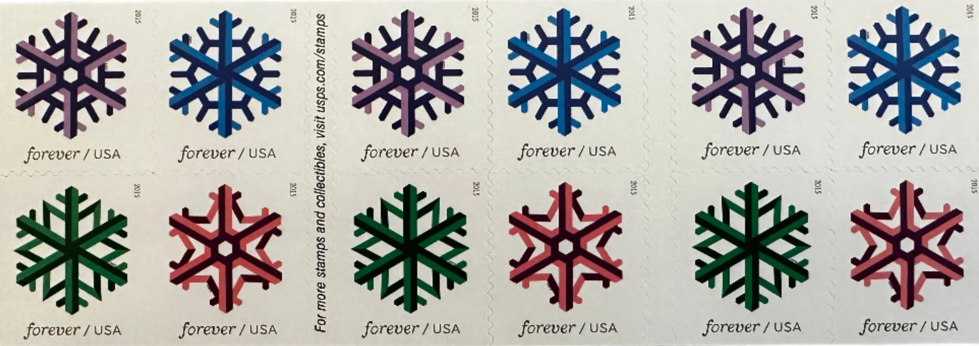 Celebrate the joys of a winter snowfall with Geometric Snowflakes, four colorful new stamps from the U.S. Postal Service. Each of the four stamps depicts a different snowflake. When it snows, untold millions of ephemeral ice crystals form unique patterns that are as stunning in their complexity as they are fleeting. This infinite variety inspired the designers to experiment with different graphic shapes. Each snowflake is drawn in one of four colors: purple, pink, green, or blue. Applying light and dark shades of color enhanced the intricate geometry of each flake and added a feeling of playfulness to the stamp art. These bright, cheerful stamps are sure to add a whimsical splash to holiday cards, thank-you notes, invitations, greeting cards, and any mailing that calls for a touch of warmth during the coldest months of the year. This listing is for a booklet of 20 stamps. These Forever stamps will always be equal to the current First-Class Mail one-ounce price. The manufacturer has discontinued the production of this item. It can be used for postage forever or saved as a collectible.